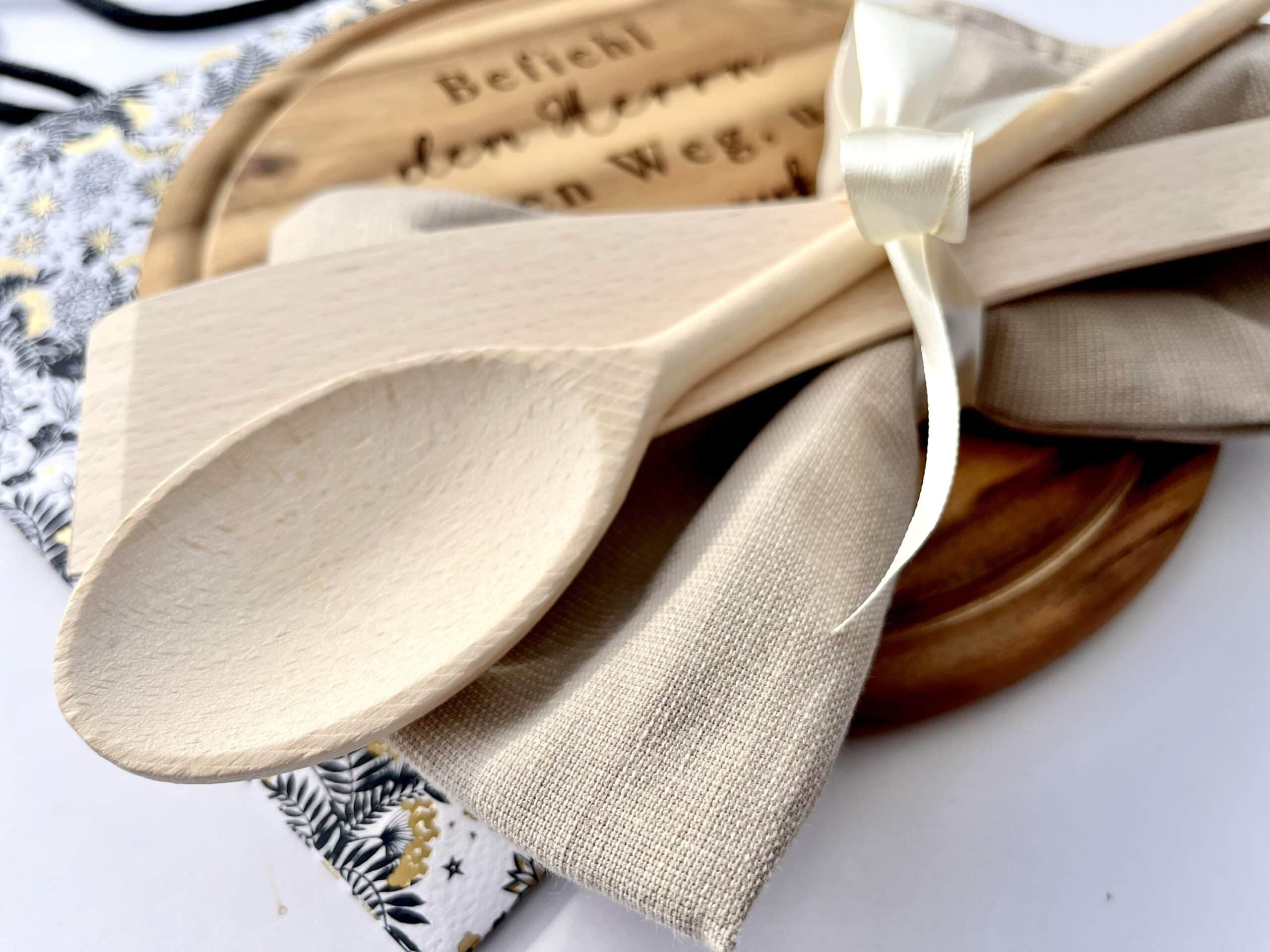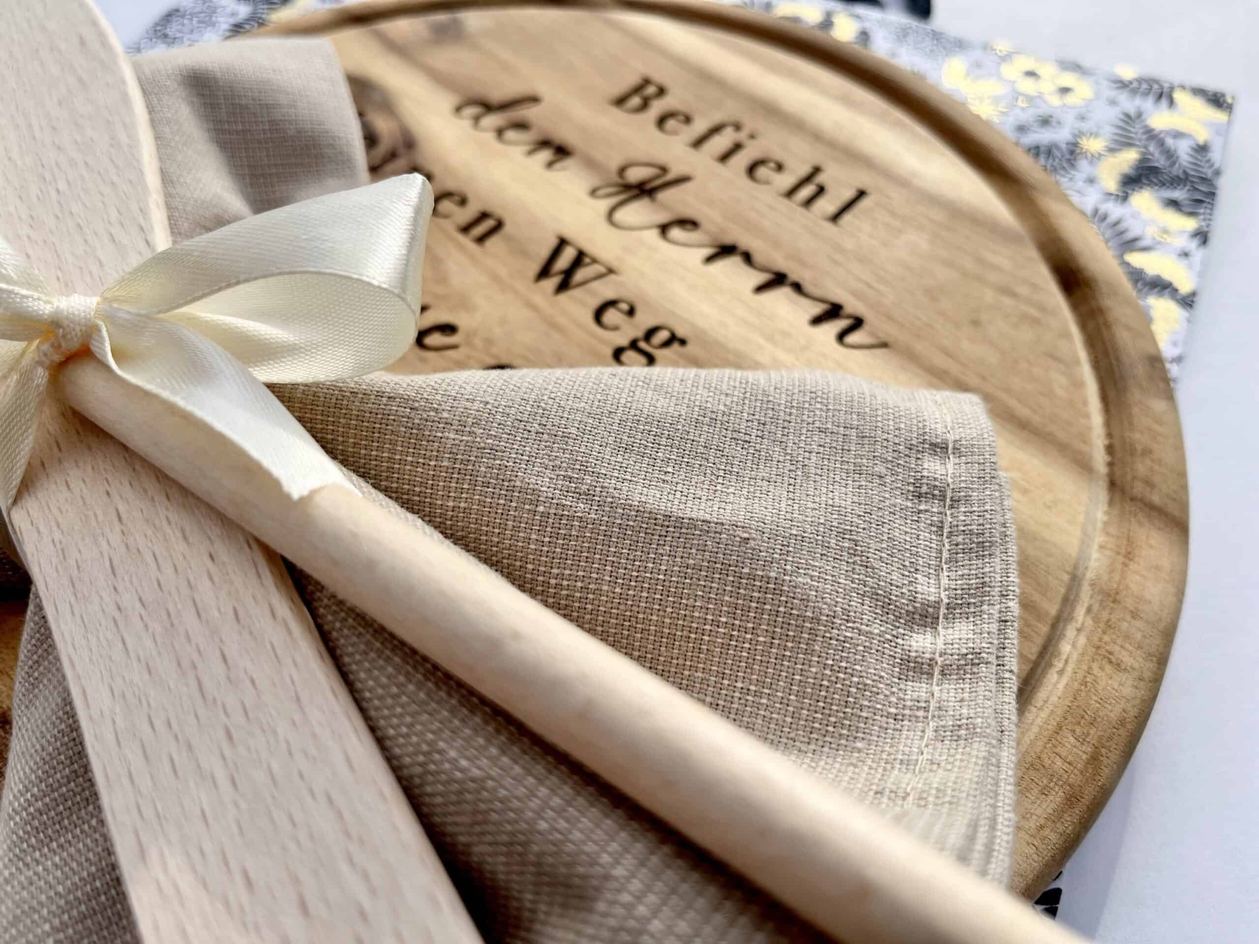 Dieses Set verbindet Nützlichkeit in der Küche mit einem ermutigenden Bibelvers, der jeden Tag stärkt. Das gravierte Holzbrett dient als Deko, Schneidebrett, Servierbrett oder Tischunterlage. Das Handtuch und der Kochlöffel ergänzen es perfekt als praktisches und schönes Küchenzubehör.