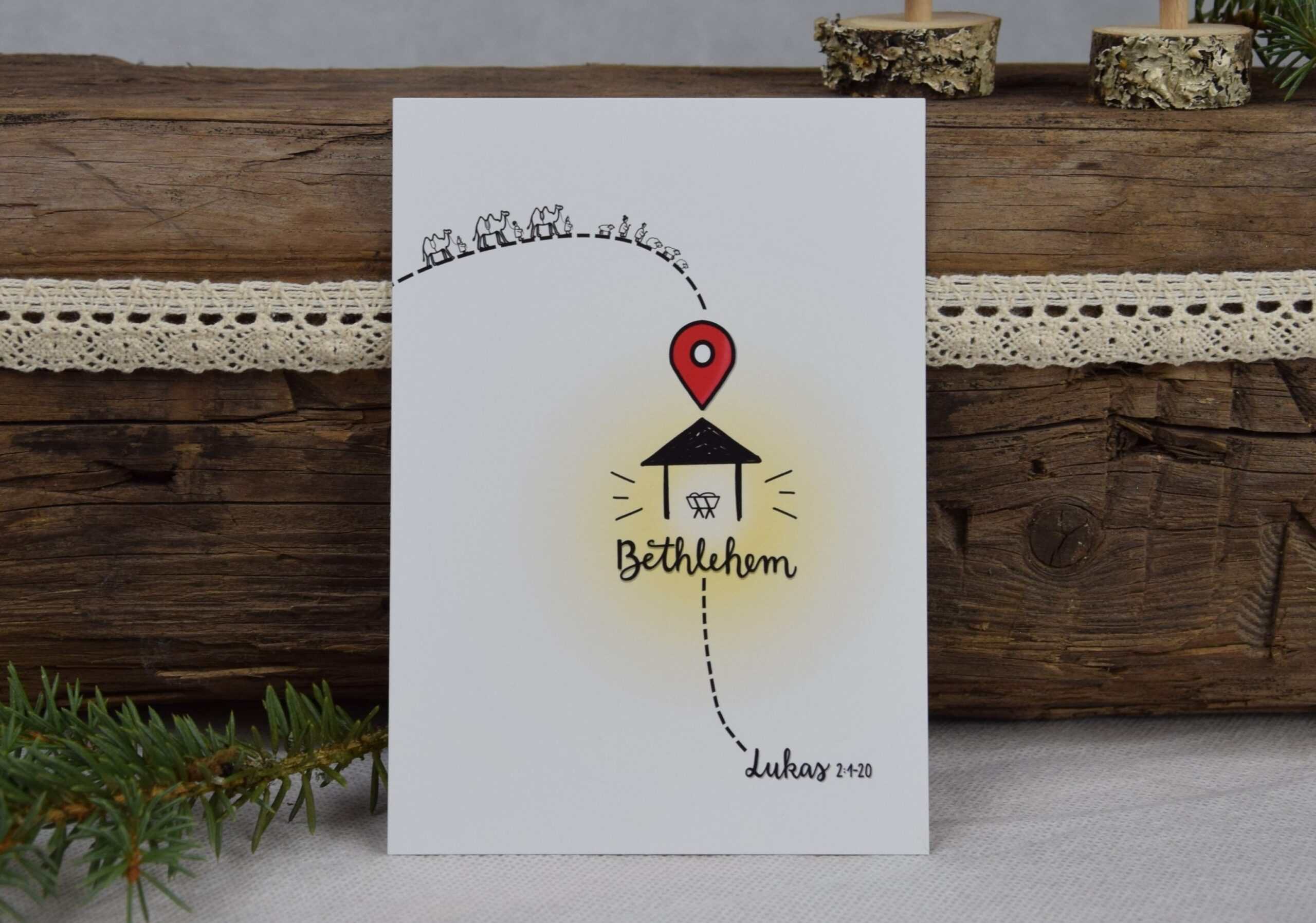 Die Weihnachtskarte “Bethlehem Maps” ist eine schlichte aber dennoch aussagekräftige Grußkarte. Kurz und symbolisch ist die Weihnachtsgeschichte auf den Punkt gebracht.