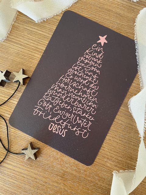 “…man nennt ihn: Wunderbarer Ratgeber, starker Gott, Ewiger Vater, Friedefürst.” Wünsche deinen Lieben ein frohe Weihnachten mit diesem Vers aus Jesaja 9,5. Gedruckt auf hochwertiges Tintoretto Gesso mit einer schönen Struktur und abgerundeten Ecken. Auf der Rückseite ist der Bibelvers noch einmal in voller Länge abgedruckt. Und trotzdem hast du Platz für einen Weihnachtsgruß.